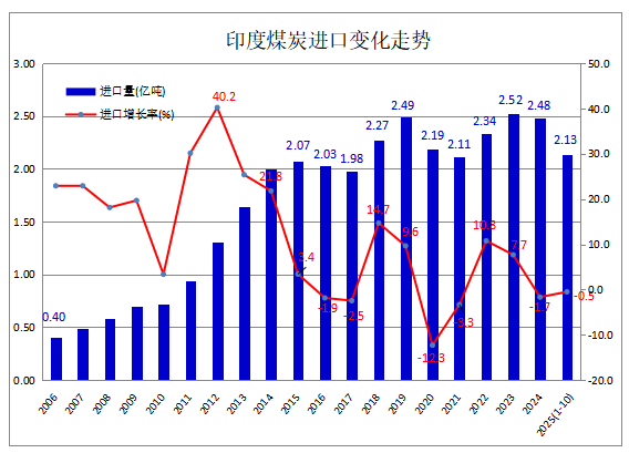 据印度商工部(Ministry of Commerce and Industry)发布的商品进出口统计数据显示,2025年1-10月,印度煤和煤焦进口量累计为2.13亿吨,较上年同期下降0.5%。