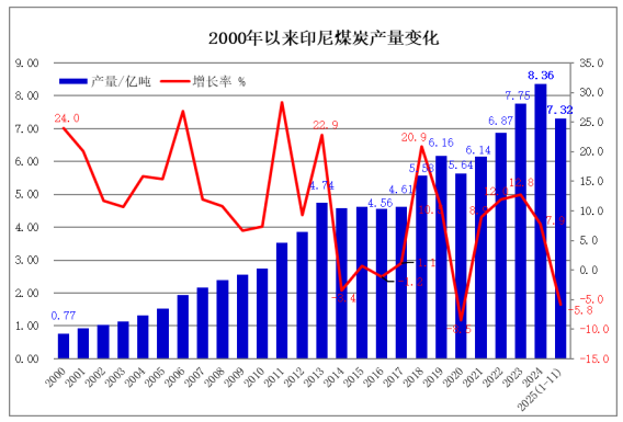 据“彭博技术”(Bloomberg Technoz)网站2026年1月7日发布的信息, 印度尼西亚煤炭矿业协会(Indonesian Coal Mining Association - APBI)报告称,2025年1-11月,印尼煤炭产量实现约7.315亿吨,较2024年同期的7.767亿吨下降5.8%。