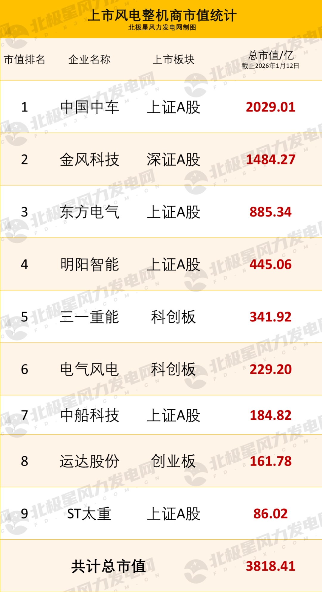 根据北极星风力发电网统计,截至2026年1月12日,国内主要上市风电整机企业总市值合计约3818.41亿元。在近期不到一个月的时间里,企业市值规模与排名已出现显著变化,其中金风科技的市值增长尤为引人瞩目。与此同时,明阳智能、三一重能、东方电气、中国中车等企业的市值也均呈现上涨态势。