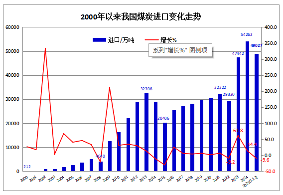 海关总署1月14日公布的数据显示,2025年1-12月份,全国煤炭进口量累计为49027.0万吨,较上年同期的54262.5万吨减少5235.5万吨,同比下降9.6%。