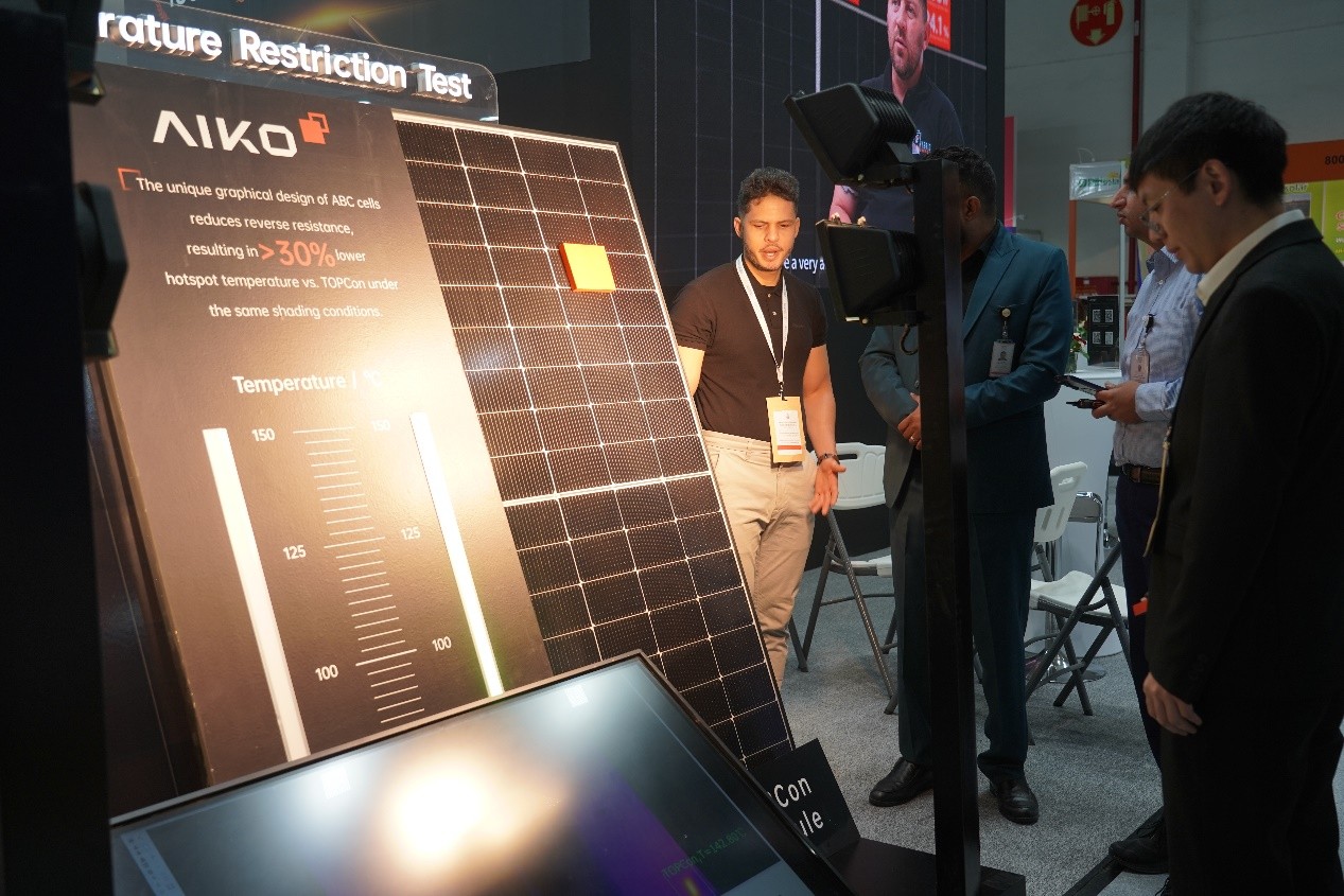 与此同时,爱旭54、60、72版型ABC满屏组件也于展会现场悉数亮相。爱旭ABC满屏组件通过精准叠焊取消片间距、隐藏汇流条,将电池片最大化铺满组件,正面纯黑,完美适配客户美学需求,量产效率最高达到25.2%。以72版型为例,爱旭ABC满屏组件可实现有效发电面积提升1.6%,组件功率可达680W至685W,领先TOPCon组件30-50W;在安全性方面,玻璃厚度相较TOPCon双玻组件高60%。抗隐裂性能进一步加强,结合优异的高温抑制性能,显著降低部分遮挡带来的热斑风险,确保极端环境下的长期安全稳定运行。