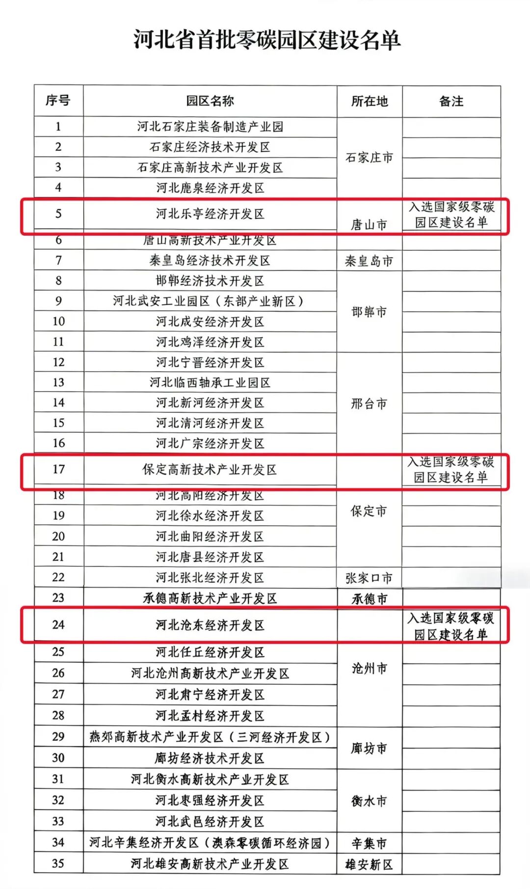 其中,河北保定高新技术产业开发区、河北沧州沧东经济开发区、河北唐山乐亭经济开发区3个园区入选首批国家级零碳园区建设名单。