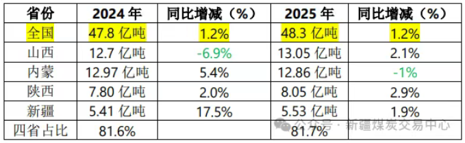 晋陕蒙新四大主产区2025年合计产量达39.5亿吨,占全国总产量的81.7%,较2024年的81.6%提高0.1个百分点,产业集中度进一步增强。