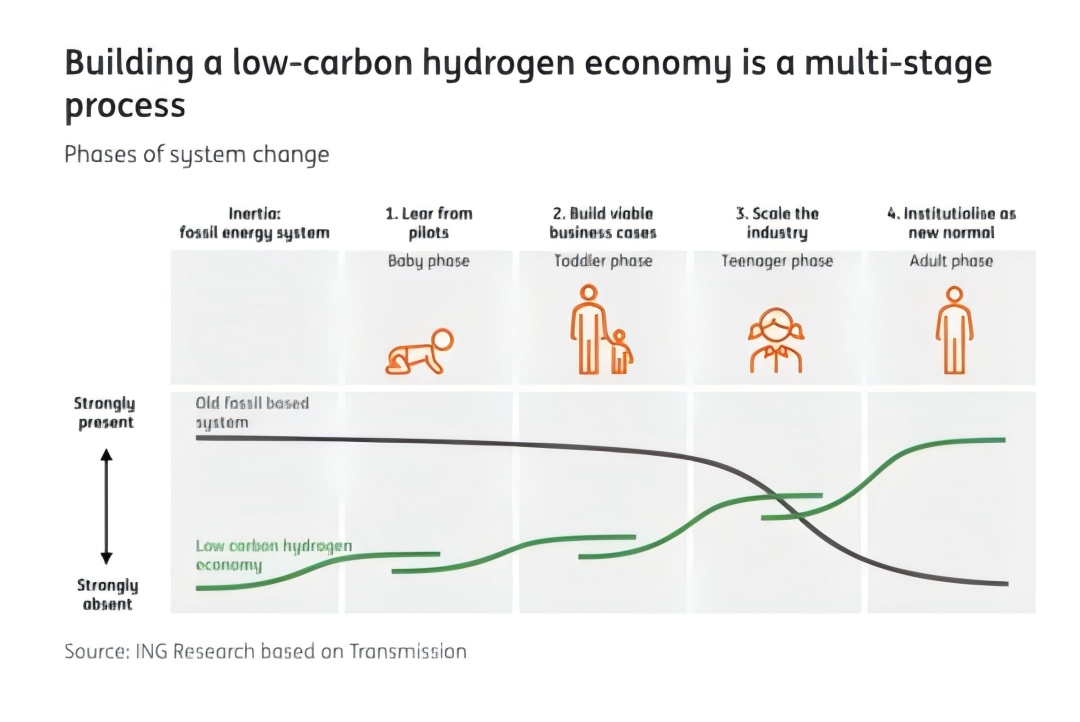 ING将氢能产业的发展比作成长过程。目前行业仍处于“婴儿期”,重点在于通过试点项目验证技术可行性,包括碳捕集、电解制氢、核能制氢、地下天然氢以及降低电解槽对稀有金属的依赖。下一阶段需要证明商业可行性,随后才可能进入规模化扩张阶段。尽管外界曾认为行业正在商业化推进,但现实是,尤其在绿氢领域,产业基本又回到了试点阶段。全球约有1700个清洁氢项目仍停留在规划阶段,推动其进入最终投资决策(FID)将是2026年及之后的重点。