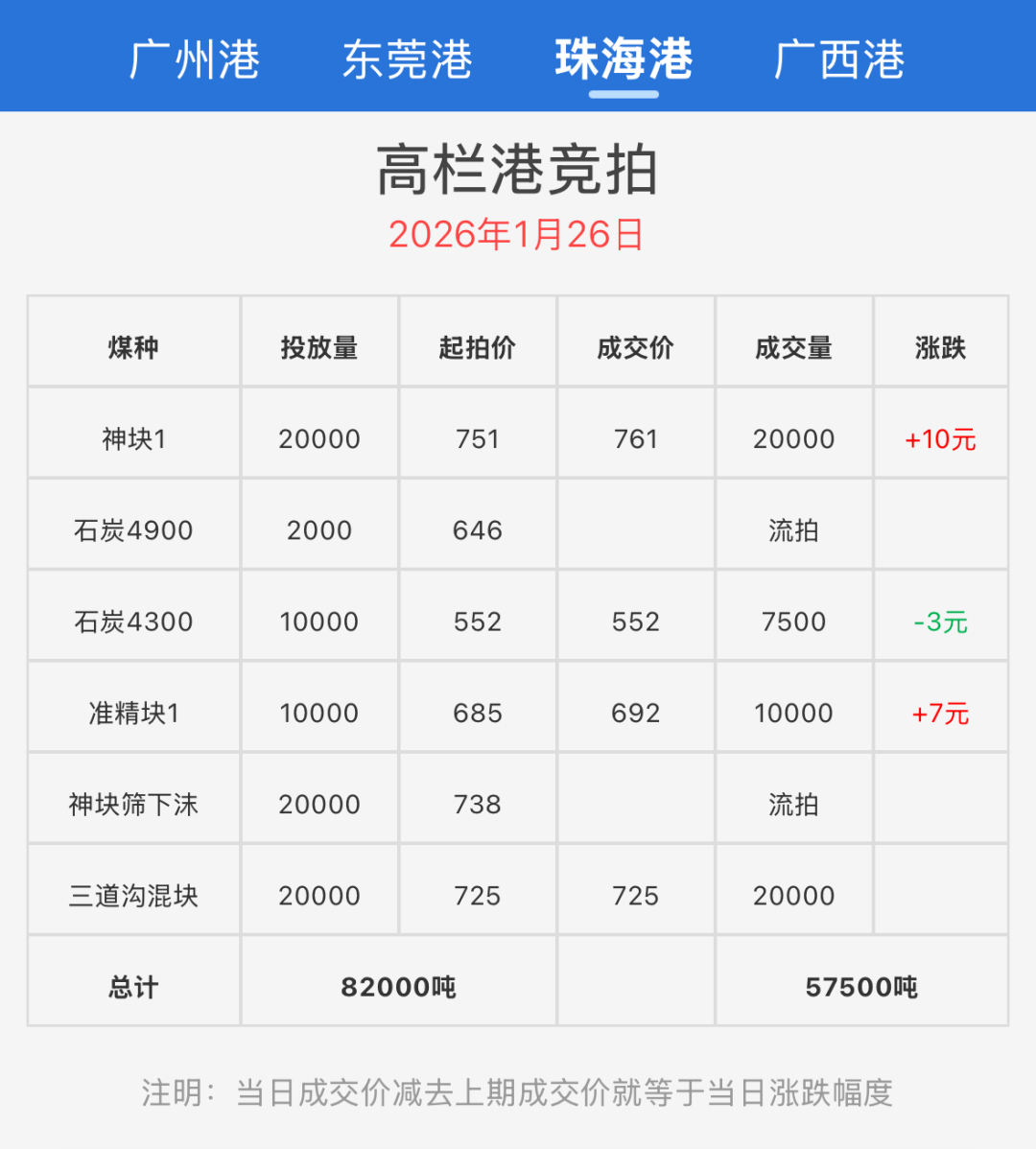 今日煤市释放多个重要信号,神华珠海高栏港竞拍突然放量,或意味着市场触底并启动补库。根据1月26日煤炭宝平台同步发布的网上竞拍与港口信息,神华在高栏港共挂牌8.2万吨竞拍煤源,实际成交量飙升至5.75万吨,买盘集中、成交节奏快。主要热门品种全部成交:神块1(30–200mm)较起拍价溢价约9–10元/吨;5500卡准精块上涨6–7元/吨,石炭4300卡等品种亦被快速抢购一空。结合国能e商平台的交易规则与煤质指标,此次成交价整体位于市场底部区间,既有贸易商抄底意愿,也反映了下游对优质煤的刚性需求。