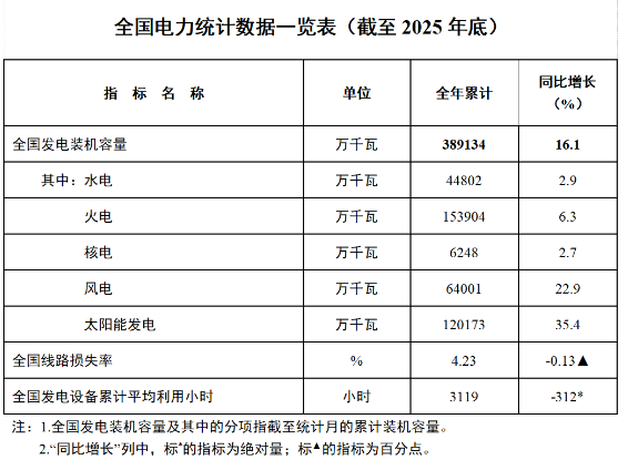 国家能源局:截至2025年底全国累计发电装机容量38.9亿千瓦