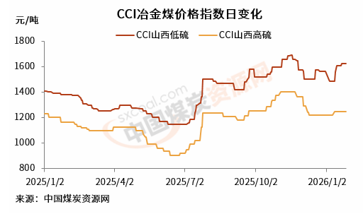 中国煤炭资源网CCI冶金煤指数显示,截止1月26日,山西低硫煤指数报1627元/吨,日环比持平,周环比上涨19元/吨;山西高硫煤指数1249元/吨,日环比持平,周环比持平。