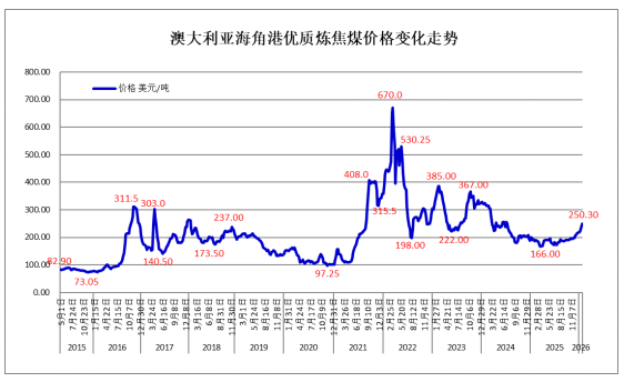 据标普全球普氏(Platts)价格指数数据显示,上周五(2026年1月23日),澳大利亚优质低挥发份(PLV)硬焦煤(HCC)离岸价(FOB)上涨至250.3美元/吨,较前一周每吨上涨15.3美元,上涨6.51%,较今年初价格上涨14.22%,创2024年7月以来18个月的新高。