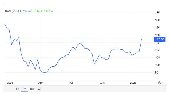 据外媒2月2日报道的消息,路孚特(Refinitiv)数据显示,上周五(2026年1月30日)交易日,全球动力煤基准洲际交易所(ICE)纽卡斯尔煤炭期货合约交易价格继续大涨,当日收盘价上涨至117.50美元/吨,环比前一交易日每吨上涨5.75美元,涨幅达5.14%,直逼预期的120美元/吨关口。