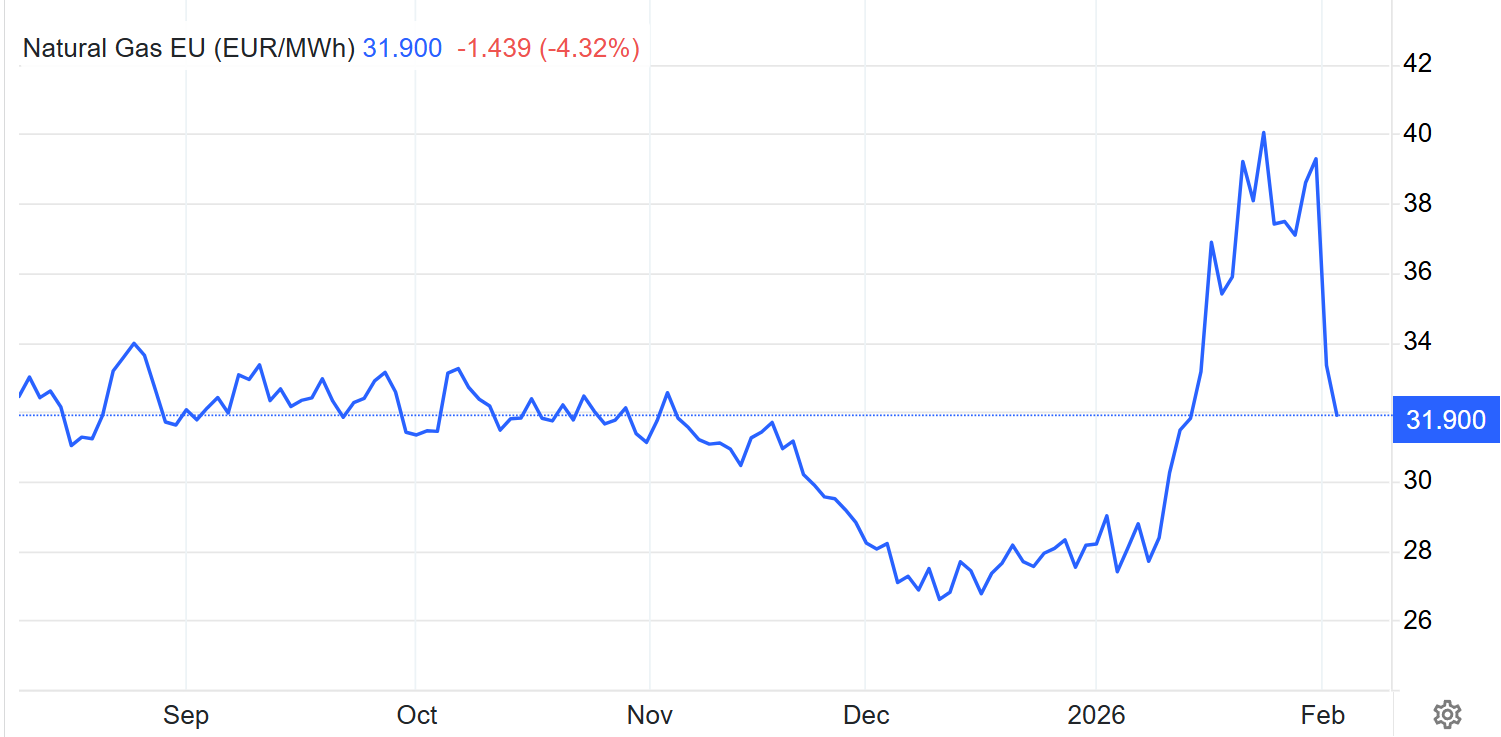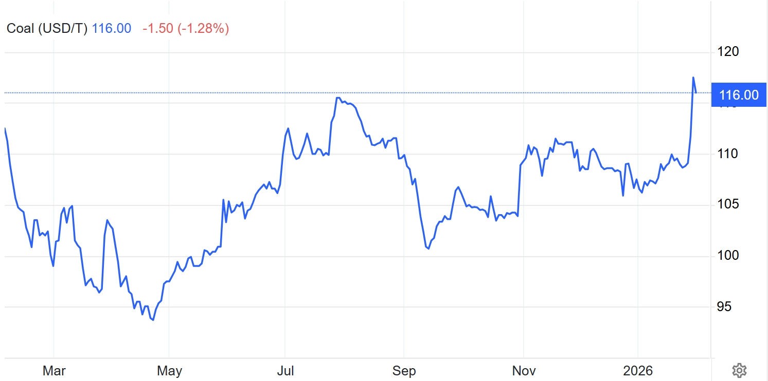欧洲方面,严寒天气席卷大陆,显著抬升居民供暖与发电用能需求,导致天然气库存快速消耗,TTF基准荷兰天然气2026年3月期货价格于1月30日收于39欧元/兆瓦时,达数月高位。此外,地缘政治风险溢价上升也间接支撑了包括煤炭在内的替代能源价格。