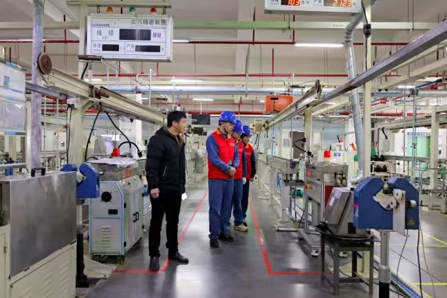 三人并未就此止步。他们走进生产车间,沿着生产线仔细巡查。在精密倒轴机旁,颜坤保停下脚步,仔细检查电源接线端子。“这些大功率设备要经常加固下,怕负荷大,接触不良会导致发热,引起故障。”他对随行的企业电工嘱咐道。