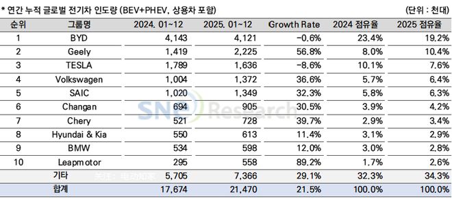 电动知家消息,2月4日,全球新能源市场调研机构SNE Research发布了2025年全年的动力电池装机量排行榜,数据显示,2025年1月至12月,全球注册的电动汽车(EV、PHEV、HEV)电池总使用量约为1,187GWh ,比去年同期增长31.7%。