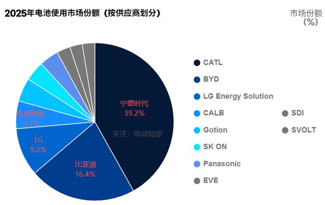 我们看到,中国电池企业再次霸榜,前十名中有六家中国企业,分别是 CATL(宁德时代),BYD(比亚迪),CALB(中创新航),Gotion(国轩高科),EVE(亿纬锂能),SVOLT(蜂巢能源)。而前三名中,CATL(宁德时代),BYD(比亚迪)分别以342GWh、194GWh占据第一名和第二名,,LG以108GWh占据第三名,此外,CATL(宁德时代)更以39.2%市占率的绝对优势领先于其他企业。我们从下面这个饼图看的更直观些,就算前十名中,中国电池市场份额已超70%,中国电池的市场份额绝对是碾压级别的。