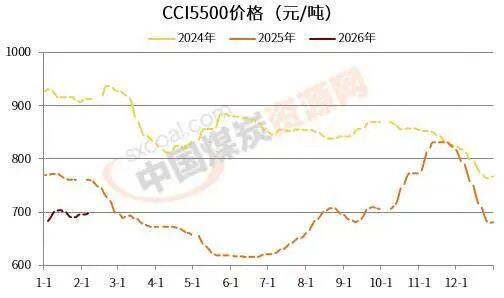 上周,多因素影响下,卖方报价上调,带动指数价格调涨。中国煤炭资源网数据显示,截至2月6日,CCI5500报收于698元/吨,较前一期上涨1元/吨;CCI5000为617元/吨,较前一期上涨2元/吨;CCI4500为530元/吨,较前一期上涨3元/吨。本轮上涨以来,分别累计上涨2元/吨、3元/吨、5元/吨。