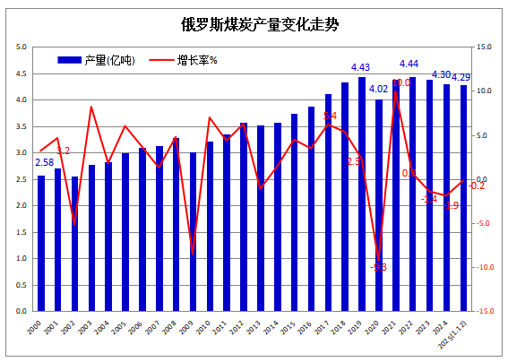 据俄罗斯联邦统计局(Росстата)2月6日发布的工业生产统计月报数据显示,2025年1-12月,俄罗斯煤炭产量累计为4.29亿吨,较上年同期基本持平,微降0.2%。