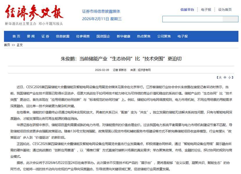 值得关注的是,本次传播不仅限于活动信息的发布,更涌现出多篇具有思想深度的专访内容。经济参考报专访江苏省储能行业协会会长朱俊鹏,提出“当前储能产业‘生态协同’比‘技术突围’更迫切”的鲜明观点,引发行业对技术创新与产业生态建设关系的深层思考。