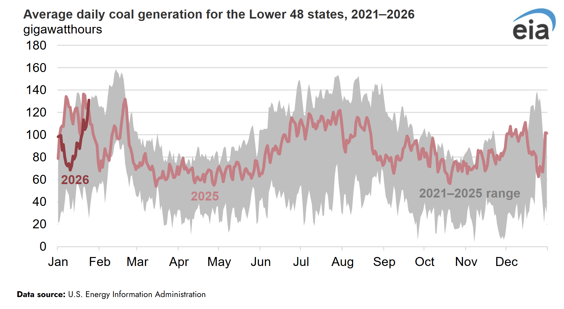 2025年冬季风暴Fern加剧美国能源短缺,凸显煤炭在极端天气下的作用。在结束于2026年1月25日的一周内,美国本土48州煤炭发电量较前一周增加31%。煤炭占总发电量的份额从前一周的17%上升至21%,成为天然气(38%)之后的第二大来源(核电第三,18%)。EIA强调,这是极端天气下电网运营商调用煤电机组增加发电的典型模式,与2021年2月和2025年1月寒潮类似。