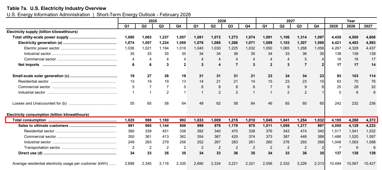 展望2026-2027年,美国电力需求预计强劲增长。在EIA发布的2026年2月份短期预测中,预计2026年电力消费从2025年的4195太瓦时(TWh)升至4268TWh,2027年进一步达4372TWh。驱动因素包括AI数据中心和供热、交通电气化。数据中心需求可能从2023年的176TWh升至2028年的325-580TWh,占全国总用电量的6.7%-12%。