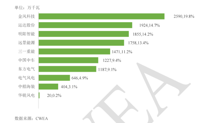2025年,国内风电市场有新增装机的整机制造企业共10家,新增装机容量排在前5家的市场份额合计为73.4%,前7家新增装机容量均超过1000万千瓦,市场份额合计为91.8%。