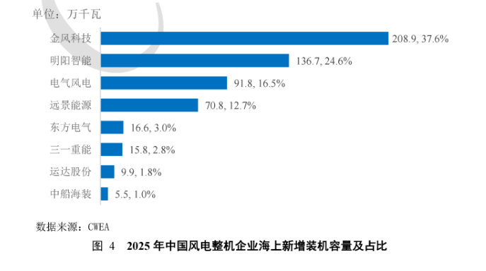2025年,风电整机装机TOP5分别是金风科技、运达股份、明阳智能、远景能源、三一重能,对应装机容量分别为25.9GW、19.24GW、18.55GW、17.58GW、14.71GW。
