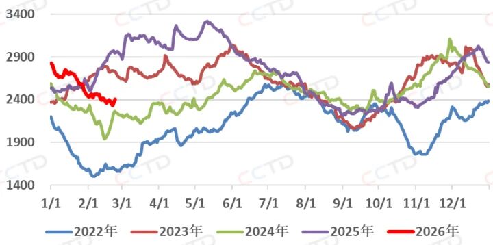 长假期间北港调入调出低位运行,随着假期临近尾声产地发运略有恢复,叠加近两日大风封航影响,北港库存长假期间先降后增。2月23日库存2403.6万吨,较14日略降11万吨,接近常年表现,同比下降545万吨。