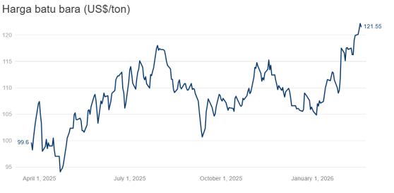 据CNBC 印度尼西亚频道2月20日报道的消息,其援引路孚特(Refinitiv)的数据显示, 周四(2月19日)交易日,全球动力煤基准洲际交易所(ICE)纽卡斯尔煤炭期货合约交易价格收于每吨121.55美元,环比前一交易日下降0.49%。这一下降打破了煤炭价格连续上涨的趋势,之前五个交易日价格持续上涨了5.1%,实现了了预期的每吨120美元关口的突破,2月18日的最高价格水平达到122.15美元/吨。