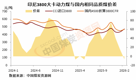 中国煤炭资源网测算数据显示,截至2月24日,进口3800大卡煤较国内相同品质煤价格倒挂17.26元/吨,较节前扩大7.69元/吨;4700大卡煤较国内煤价差为13.62元/吨,较节前收窄6元/吨。