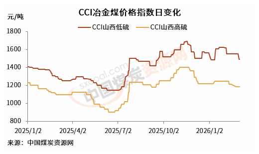 中国煤炭资源网CCI冶金煤指数显示,截止3月3日,山西低硫煤指数报1493元/吨,周环比下降60元/吨;山西高硫煤指数1184元/吨,周环比持平。