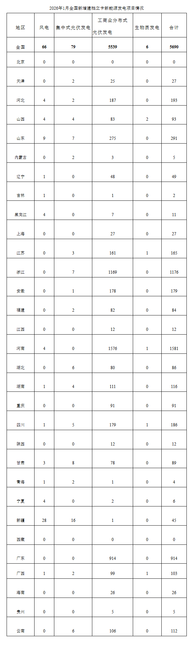 国家能源局发布数据显示,2026年1月,全国新增建档立卡新能源发电(不含户用光伏)项目共5690个,其中风电项目66个,光伏发电项目5618个(集中式光伏发电项目79个,工商业分布式光伏发电项目5539个),生物质发电项目6个。