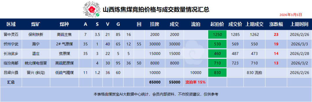 3月5日山西炼焦煤竞拍成交情况汇总