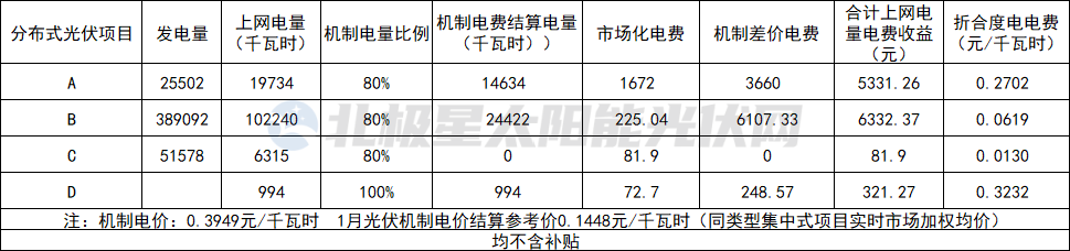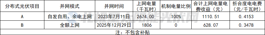 从电费单来看,浙江省分布式光伏项目还未承担市场化运行费用,非补贴部分的上网电费主要来自于两部分,一是上网电量费用,即上网电量×光伏项目市场交易均价;二是机制电价差量结算电费,等于上网电量×机制电量比例×(机制电价-市场交易均价)。以此存量项目A机制电量比例100%,最终上网电量电价与燃煤基准价持平;增量项目B,暂未参与机制竞价,因此无机制电量比例,只能结算第一部分的电能量电费,上网度电电价较燃煤基准价降低16%。