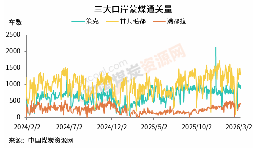 同期,策克口岸蒙煤日均通关量为943车,较前一周水平增加113车。此外,满都拉口岸蒙煤日均通关396车,较前一周2月24-28日日均水平增加89车。