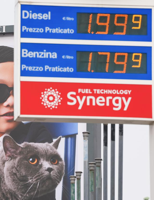 这是3月11日在意大利米兰市中心拍摄的一家加油站的油价牌。新华社记者 李京 摄