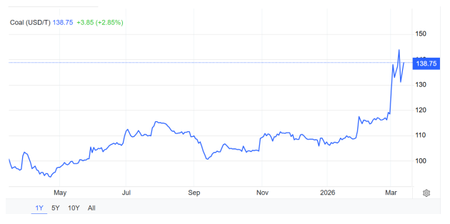 路孚特(Refinitiv)数据显示,周四(3月12日)交易日,全球动力煤基准洲际交易所(ICE)纽卡斯尔煤炭期货次月交割合约交易价格再度连续上涨,收于每吨138.75美元,再度逼近140美元,环比前一个交易日上涨3.85美元,涨幅为2.85%。最近两个交易日内累计上涨了5.8%。