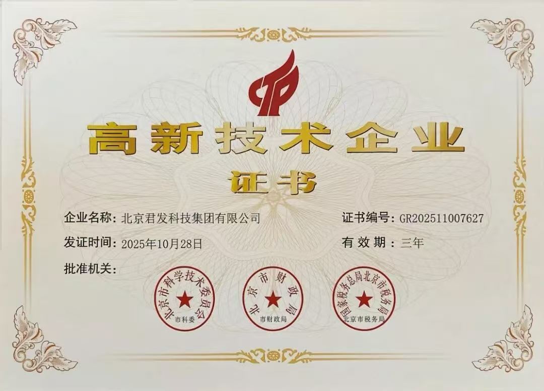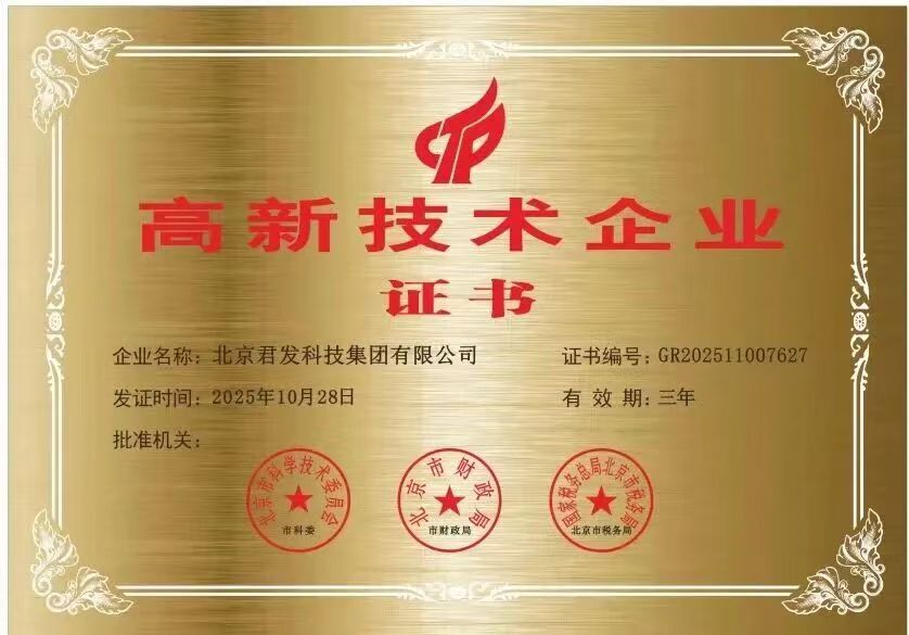 3月5日,北京君发科技集团有限公司(以下简称“君发科技”)正式取得国家级“高新技术企业”证书,该证书由北京市科委、北京市财政局、国家税务总局北京市税务局联合颁发。这一殊荣标志着君发科技在核心自主知识产权、科技成果转化能力及研发组织管理水平等方面均达到了国家顶尖标准,是继国家能源局《2021年度能源领域首台(套)重大技术装备项目》与自然资源部《矿产资源节约与综合利用先进适用技术目录》(2022版与2025 版)对君发科技煤矿低浓度瓦斯综合利用技术给予高度认可后,对集团公司整体创新实力与发展质量的又一重磅肯定。