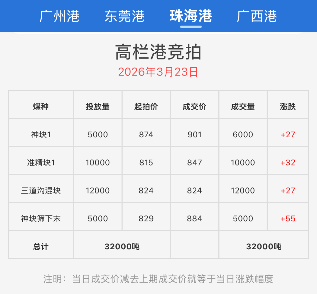 3月23日神华珠海高栏港竞拍统计表