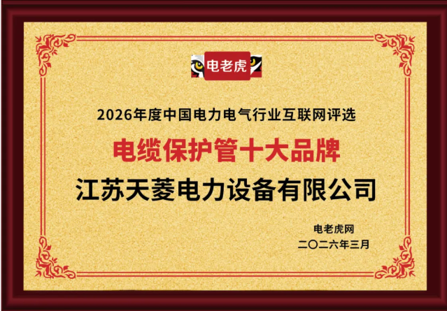 近日,行业权威评选结果揭晓,江苏天菱电力设备有限公司凭借过硬的产品品质、稳定的供货能力与良好的市场口碑,成功荣获 “电缆保护管十大品牌” 荣誉称号,彰显企业在电缆保护管领域的专业实力与品牌影响力。