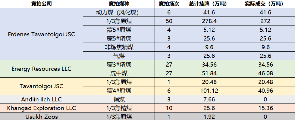 另一主要供应商Erdenes Tavantolgoi JSC方面:1/3焦原煤累计挂牌278.4万吨,成交49场,仅流拍1场,成交率极高,成交价介于58.4至111.7美元/吨(指标有差异);蒙5#原煤累计挂牌5.12万吨,全部成交,成交价介于121.6至145.5美元/吨;蒙5#精煤累计挂牌25.6万吨,全部成交,成交价介于124.3至126.3美元/吨。