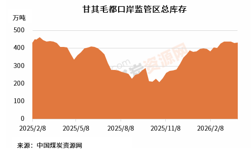 在经过两周小幅降库之后,甘其毛都口岸库存上周再度累积。中国煤炭资源网统计的最新周度数据显示,截至4月5日,甘其毛都口岸监管区蒙煤库存达到433.8万吨,较前一期数据增加1.1%。