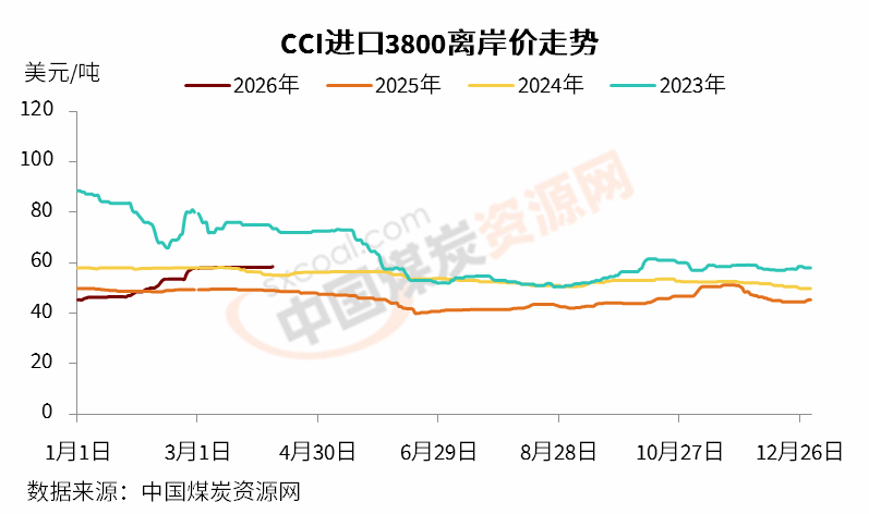 截至4月3日,CCI进口3800大卡动力煤离岸价为58.2美元/吨,较前一周持平,较上月同期上涨0.2美元/吨;CCI进口4700大卡动力煤离岸价为76.5美元/吨,较前一周上涨0.3美元/吨,较上月同期持平。