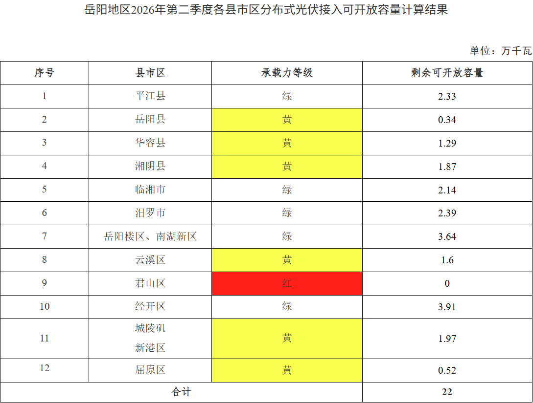 根据计算原则,国网湖南电力经营区岳阳地区各县市区分布式光伏接入可开放容量为22万千瓦。