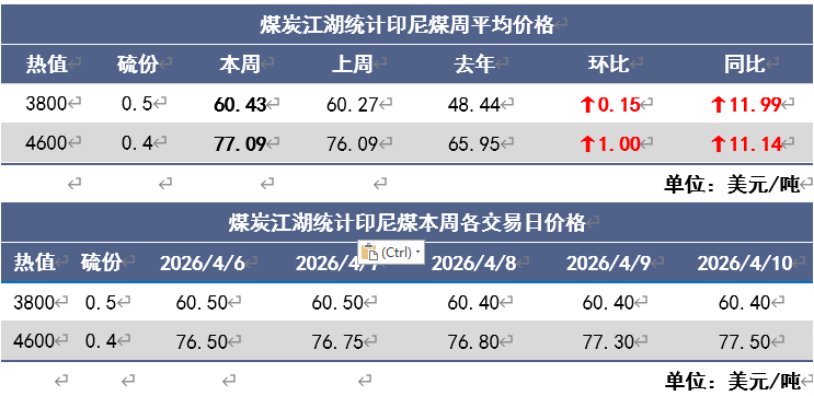 截至上周五,印尼煤3800卡报价为FOB60.4美元/吨,周环比略回调了0.1美元/吨;4600卡报价为FOB77.5 美元/吨,比上周上涨了1.05美元/吨。