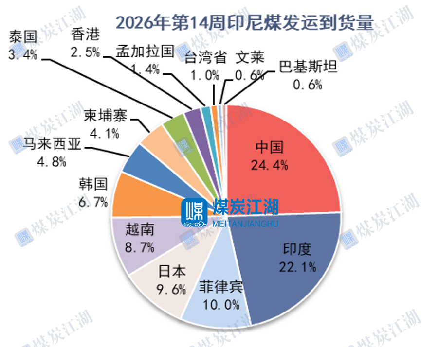 2026年第14周(3.30-4.5),世界各国进口印尼煤到货量为705万吨,合计120艘船。其中中国到货量172万吨、印度到货量156万吨、菲律宾到货量71万吨、日本到货量68万吨。