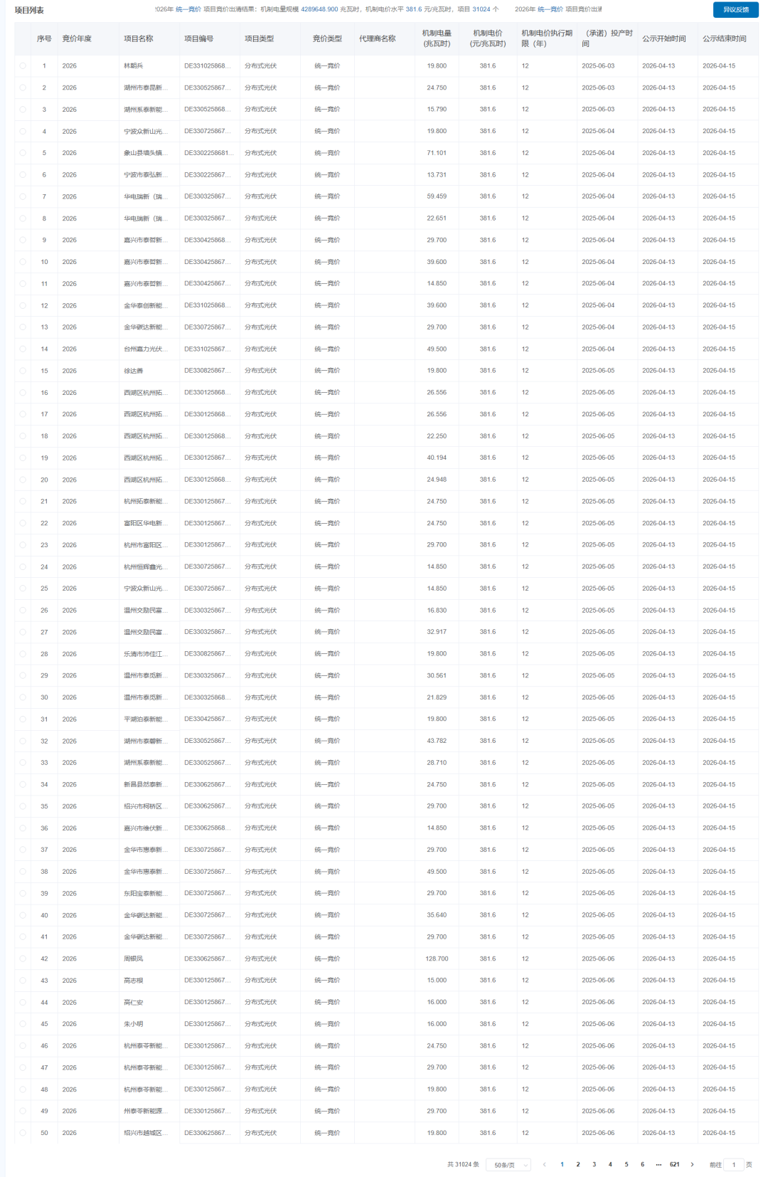 4月13日,国网新能源云公示了浙江省2026年机制电价统一竞价结果,光伏机制电价为0.3816元/度,入围机制电量为42.9亿度,入围项目31024个。