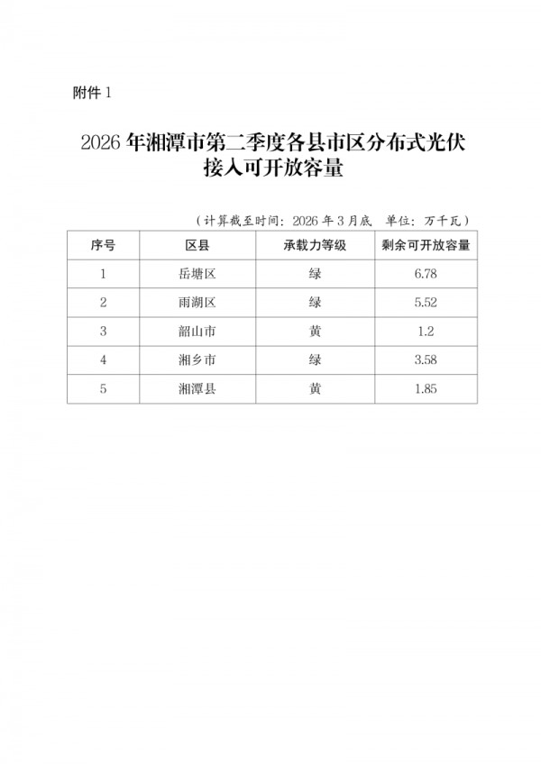截至2026年3月底,湘潭市累计并网分布式光伏装机规模达91.75万千瓦,2026年第二季度分布式光伏可开放总容量为18.93万千瓦,其中各县市区可开放容量及受限设备清单详见附件1、2。