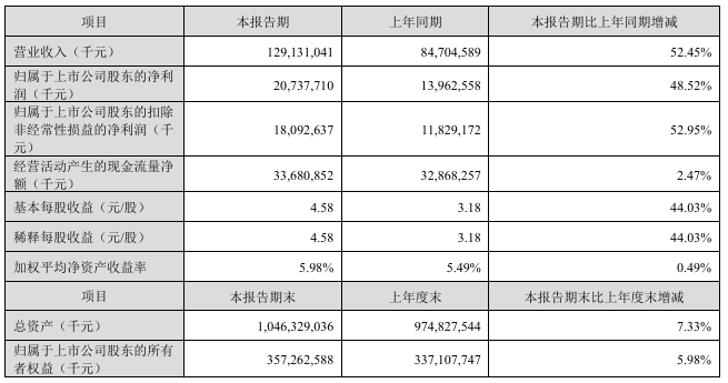 4月15日,宁德时代新能源科技股份有限公司发布2026年第一季度报告。报告显示,2026年第一季度宁德时代实现营业收入1291.31亿元,较上年同期的847.05亿元增长52.45%;归属于上市公司股东的净利润达207.38亿元,同比增长48.52%;扣非后净利润180.93亿元,同比增幅52.95%。
