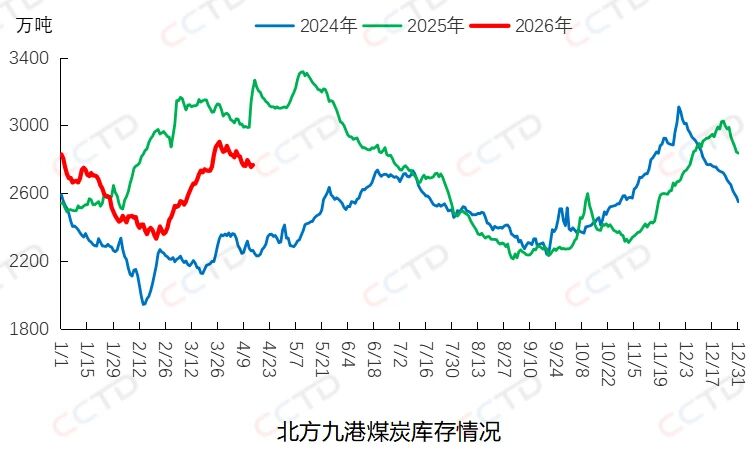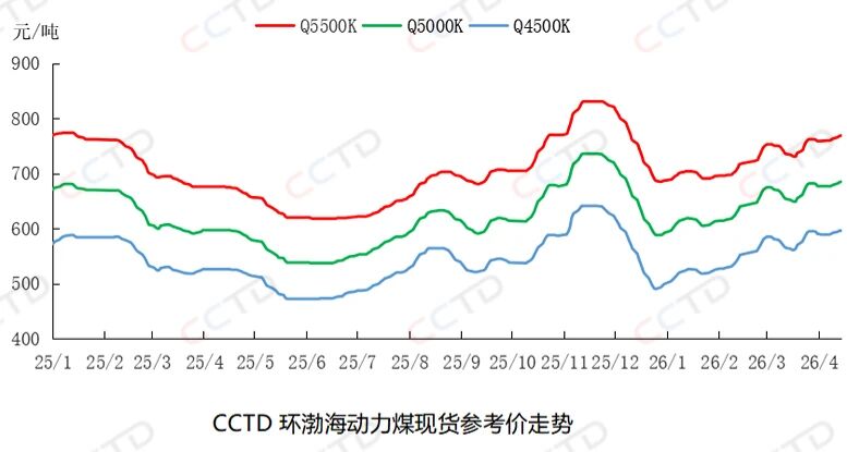 虽然当前正值电煤消费淡季,但受北方港口煤炭库存持续下降、进口煤价格强势、地缘冲突存在再度升温预期等因素的影响,卖方报价坚挺。截至4月15日,“CCTD环渤海动力煤现货参考价”5500K、5000K、4500K三个规格品价格分别收于769、685、596元/吨,日环比分别上涨1、1、0元/吨。