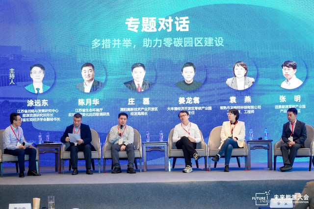 江苏省战略与发展研究中心能源资源研究所所长、江苏省宏观经济学会副秘书长涂远东主持“多措并举,助力零碳园区建设”专题对话,江苏省生态环境厅应对气候变化处四级调研员陈月华、溧阳高新技术产业开发区经发局局长庄磊、大丰港经济开发区零碳产业园副主任姜龙翥、常熟市龙腾特种钢有限公司工会主席、工程师袁燕、远景能源零碳产业园产品开发总监张明等行业专家共同参与,探讨零碳园区的发展与建设。