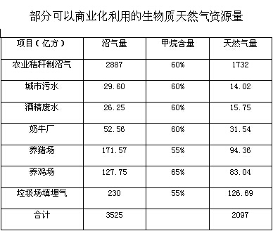 在广东、广西、海南和云南,为生产蔗糖和淀粉,种植大量甘蔗和木薯。利用制糖剩余物糖蜜生产酒精,再利用酒精废水生产沼气。根据中国糖蜜网数据,中国每年生产糖蜜450万吨,糖蜜资源中57%用于酒精生产,为256.5万吨,可生产10.26亿方天然气。据研究,每吨干木薯制酒精排放10吨高COD浓度有机废液,每吨木薯制淀粉可排放15吨高COD浓度有机废液,而每吨木薯变酒精废液可产生12方的沼气,每吨木薯制淀粉废液可产生8方的沼气。处理1吨木薯可生产沼气120方,提纯商品级天然气72方。广西是我国木薯生产第一大省,2005年种植面积460万亩,占全国74%;年产鲜薯559万吨,占全国76%。据此推算,全国可利用木薯废弃物生产天然气5.83亿方。